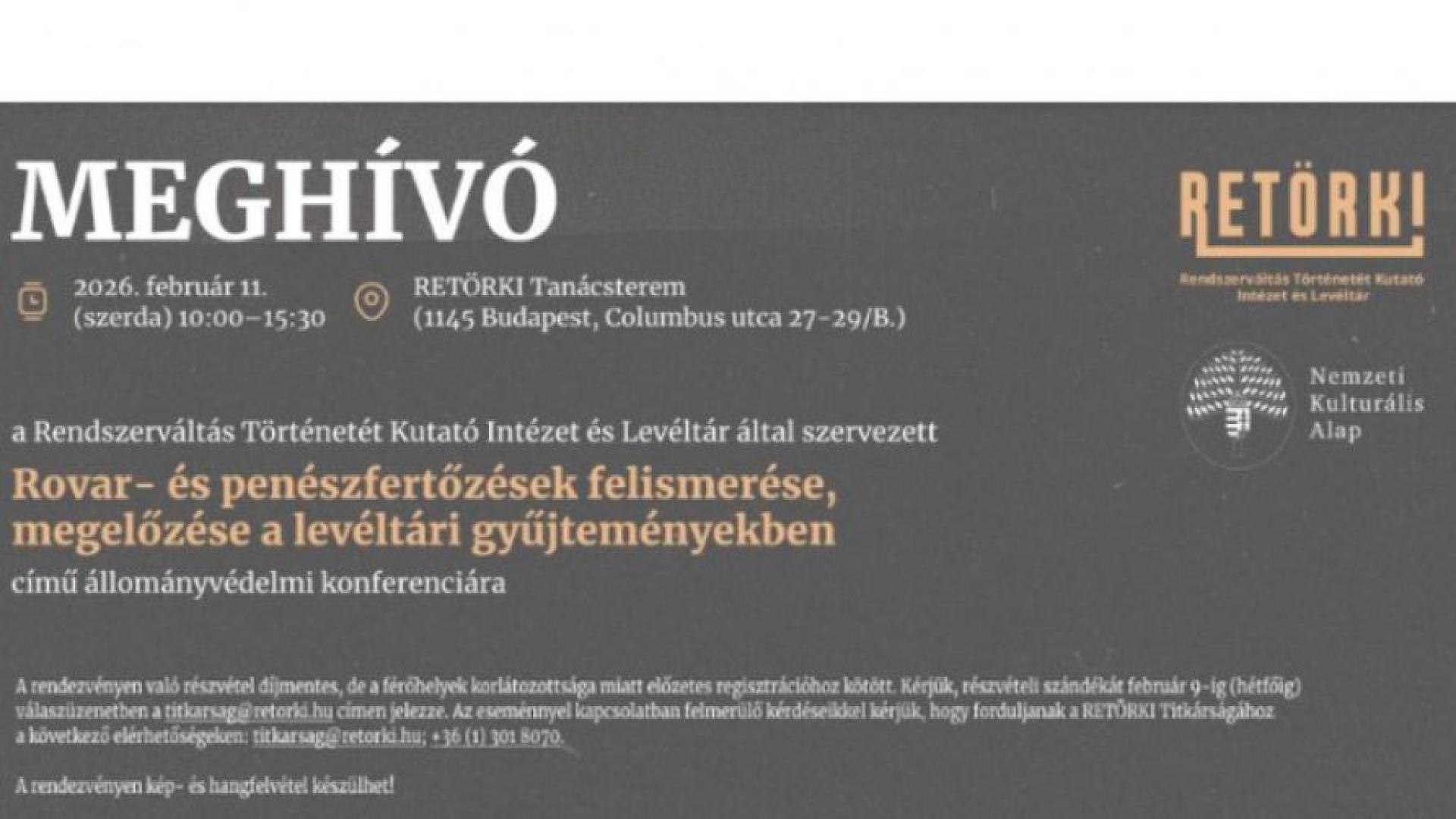 A Rendszerváltás Történetét Kutató Intézet és Levéltár állományvédelmi konferenciát szervez. Időpont: 2026. február 11. (szerda) 10:00-15:30 Helyszín: RETÖRKI Tanácsterem (1145 Budapest, Columbus utca 27-29/B.) A rendezvényen való részvétel díjmentes, de a férőhelyek korlátozottsága miatt előzetes regisztrációhoz kötött. Részvételi szándékukat február 9-ig (hétfőig) üzenetben a titkarsag@retorki.hu címen jelezhetik.